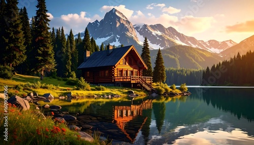 © Prap, Fototapeta premium Lakeside log cabin at sunset