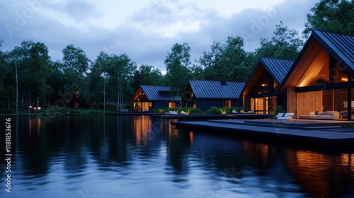 © Ashalina, Fototapeta premium Lakeside Luxury: Illuminated Cabins at Dusk