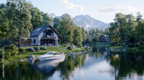 © kinara art design, Fototapeta premium Lakeside modern home with boat, mountain view.