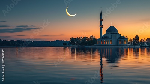 © arsyi_06, Fototapeta premium Lakeside mosque at sunset with crescent moon.