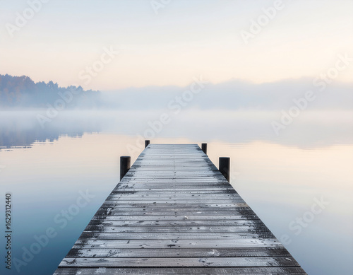 © LayerBloom, Naklejka premium Lakeside Pier with Morning Mist