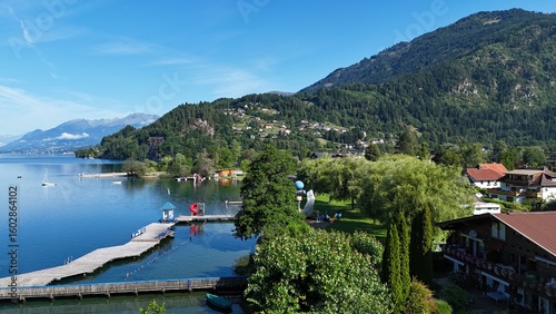 © Jekaterina, Naklejka premium Lakeside Promenade and Village with Wooden Piers and Mountain Backdrop in Summer