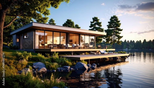 Obraz premium Lakeside Retreat Modern Cabin with Dock on Serene Water at Sunset.