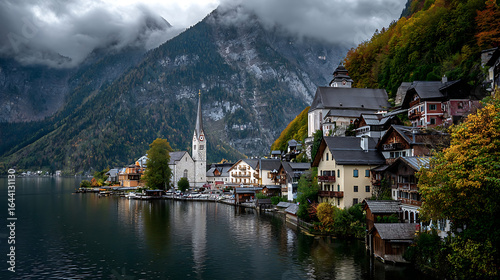 Naklejka premium Lakeside village nestled against misty mountains with autumn foliage image