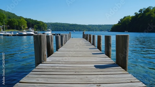 © almeera, Obraz premium Lakeside wooden pier leading to a tranquil harbor