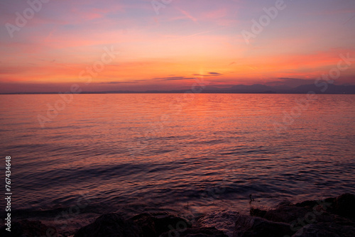 Naklejka premium Lakeview at sunset from walkway at Cisano, Bardolino, Lake Garda, Italy
