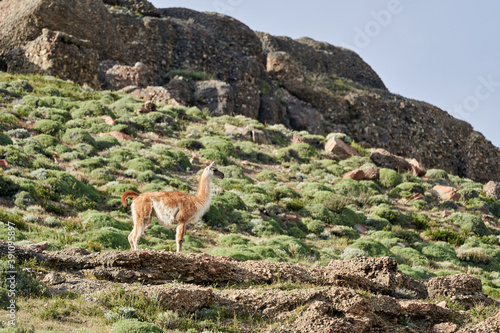 © Jens, Obraz premium Lama guanicoe is a camelid native to South America, closely related to the domesticated llama. Guanaco standing in green gras of Torres del Paine national park in Patagonia with montains of the Andes