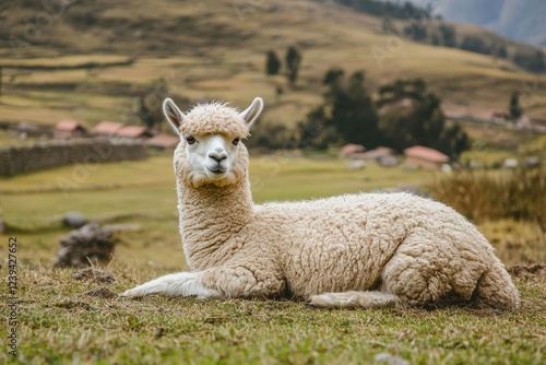 Fototapeta premium Lama vicugna relaxes on a farm its soft wool comes from Peru s national animal