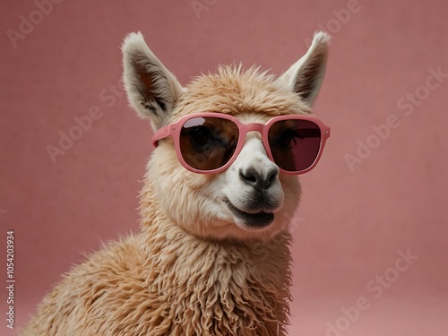 © claudunia, Obraz premium Lama with bubblegum in pink sunglasses on pink background
