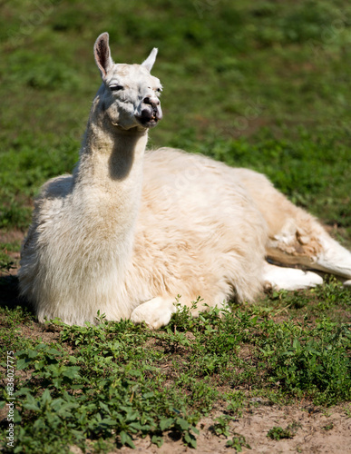 Fototapeta premium Lama with his head lying on the grass