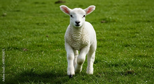 © Chinthaka, Obraz premium Lamb running toward camera in a green pasture