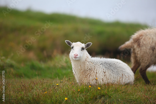 © sugar0607, Fototapeta premium Lamb sheep lying in the grass meadow