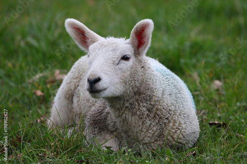 © UniquePhotoArts, Obraz premium Lamb sitting in a field