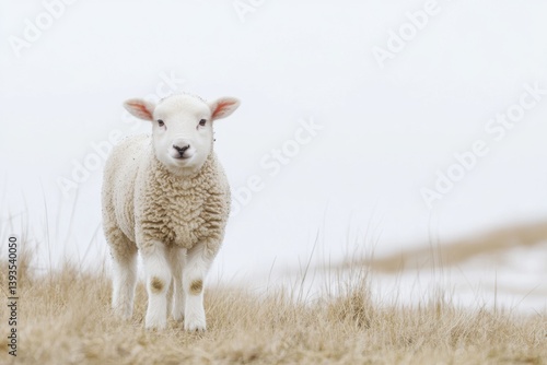 © Anat art, Obraz premium Lamb standing in lush grass against a soft white background during a calm day