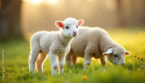 © oliamogdaleva, Fototapeta premium Lamb standing near mother sheep in green meadow. Spring rural atmosphere.
