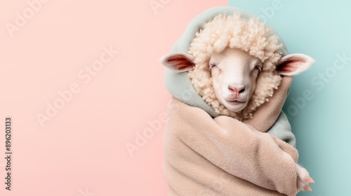 Obraz premium Lamb wrapped in a beige blanket against a split pastel pink and blue...