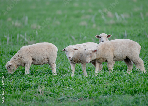 © Bruce, Obraz premium Lambs grazing in a lush green field.