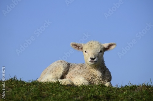 © Ingeborg Knol/imageBROKER, Naklejka premium Lamm, Domestic sheep (Ovis gmelini aries) sits on dike, Westerhever, Schleswig-Holstein, Germany, Europe