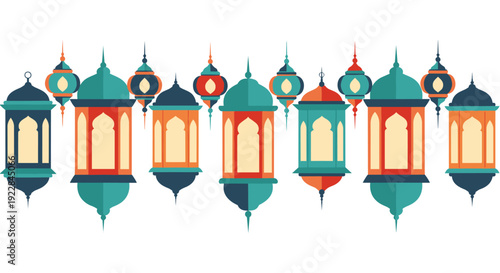 © Sam Senzu, Obraz premium Lamp Eid Mubarak Islamic background template flat vector Illustration.