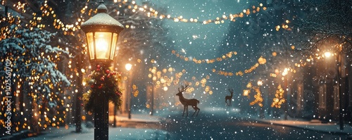 © Naseem, Naklejka premium Lamp post street poster for the holidays, featuring Christmas deer lights and snow.