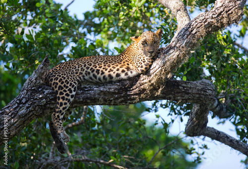 © gudkovandrey, Obraz premium Lampart leży na dużej gałęzi drzewa. Sri Lanka. Doskonała ilustracja.