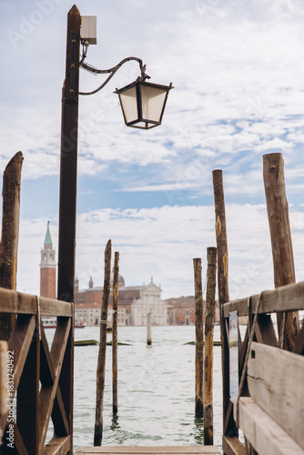Fototapeta premium Lamppost and dock with San Giorgio Maggiore in Venice