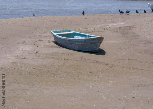 © AnaPliego, Naklejka premium Lancha varada en la arena con fondo del mar y aves