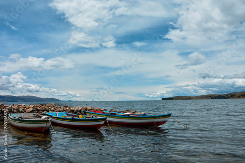 Naklejka premium lanchas coloridas de madera en lago y de fondo nubes