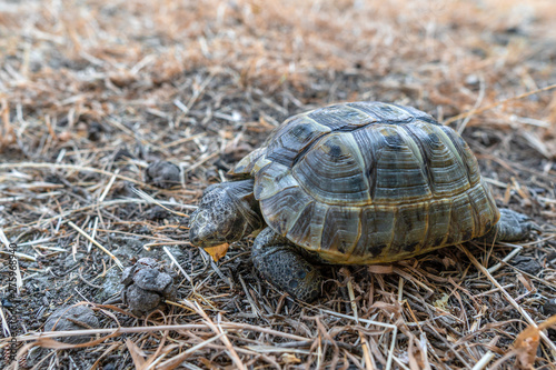 © Vastram, Obraz premium Land tortoise walking on dry grass
