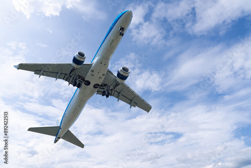 © scharfsinn86, Obraz premium Landing airplane on the background of blue sky.