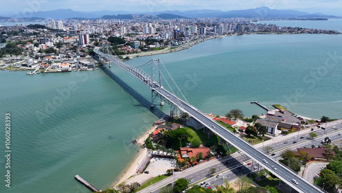© bydronevideos, Naklejka premium Landmark Bridge At Florianopolis In Santa Catarina Brazil. Coast City. Downtown District. Cityscape Scenery. Landmark Bridge At Florianopolis In Santa Catarina Brazil. Landmark Bridge.