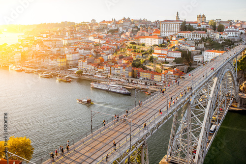 Obraz premium Landscape aerial view on the Luis bridge on the Douro river in Porto city during the sunset in Portugal