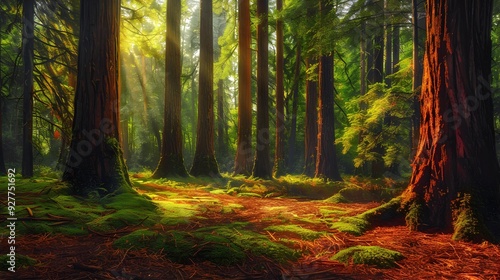 © Yelena, Obraz premium Landscape among redwoods where tall trees create shade
