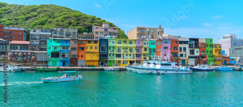 © Jo Panuwat D, Obraz premium Landscape and Cityscape of Colorful Zhengbin Fishing Port visiting in Keelung. landmark and popular for tourists attractions near Taipei city, Taiwan