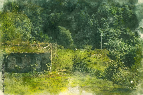 Obraz premium Landscape and traditional house in Georgia, Hulo. Painting watercolor.