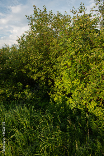 Fototapeta premium Landscape at sunset. Densely overgrown trees