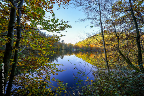 © Elly Miller, Fototapeta premium Landscape at the Seehofweiher pond in the Porzbach Valley. Waters along the Porzbach stream in the forest. Autumnal nature at the bathing lake.