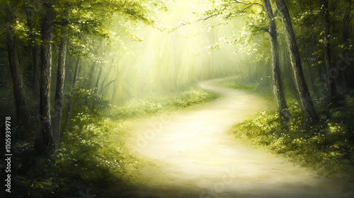 © Supapich, Naklejka premium Landscape background serene forest trail winding through tall trees with dappled sunlight