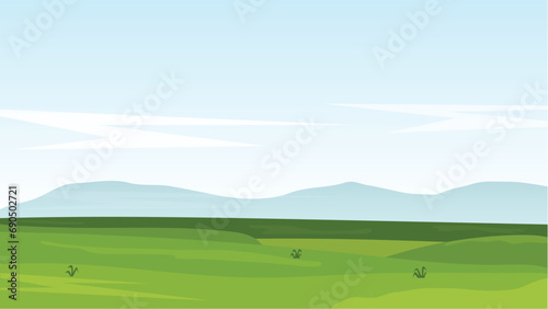 Fototapeta premium landscape cartoon scene with green field and white cloud in summer blue sky...