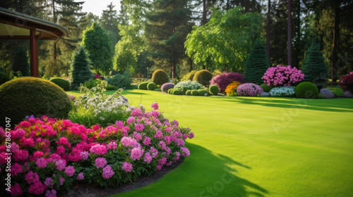 Fototapeta premium Landscape design with flower beds in home garden, beautiful landscaping in residential house backyard. Scenic view of beautiful landscaped garden, scenery of luxury backyard in summer. Nature theme.