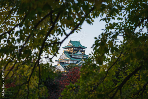 © Adam, Fototapeta premium Landscape evening view of Osaka Castle framed by trees in Osaka, Japan.