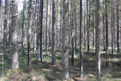 © Elena Bondareva, Naklejka premium landscape fairy forest in the rays of the sun in spring