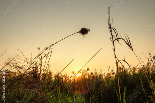 Obraz premium Landscape flowers grass in fields with sunset background in the evening