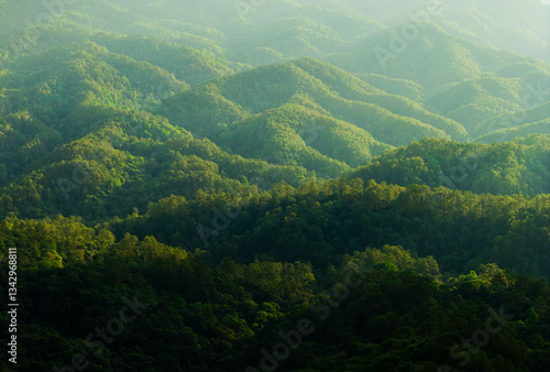 Fototapeta premium Landscape, forest and green mountains in summer in Asia