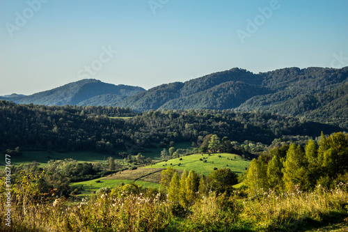 © Olga, Fototapeta premium Landscape forest in the mountains. Glade in the mountains. Summer. Background. Texture.