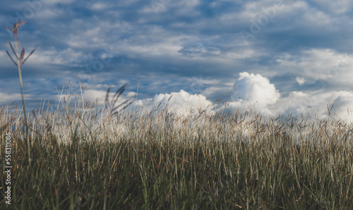 Fototapeta premium Landscape grassland meadow and cloudy sky with sunlight low lighting.
