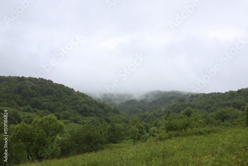 © Наталья Николаева, Fototapeta premium landscape. green mountains in haze. rainy cloudy weather