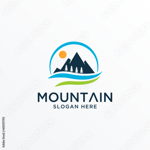 Fototapeta premium Landscape Hills minimalist, Mountain logo with trees and river vector template.