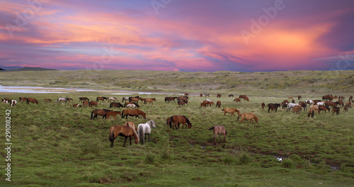 © qwertfak, Obraz premium Landscape. Horses graze in the meadow during sunset. Siberia. Republic of Tuva. Russia.