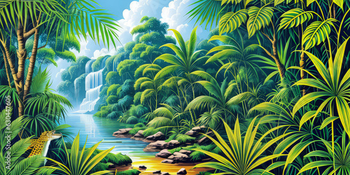 © Supriyanto, Obraz premium Landscape Illustration Island Fantasy 3D Realistic Jungle Environment With Waterfall